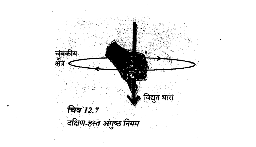 उतर – आप अपने दाहिने हाथ में विद्युतधारावाही चालक को इस प्रकार पकड़े हुए हैं कि आपका अंगूठा विद्युतधारा की दिशा की ओर संकेत करता है, तो आपकी अंगुलियां चालक के चारों ओर चुम्बकीय क्षेत्र की क्षेत्र रेखाओं की दिशा में लिपटी होंगी (चित्रानुसार) इसे दक्षिण हस्त अंगुष्ठ नियम कहते हैं।