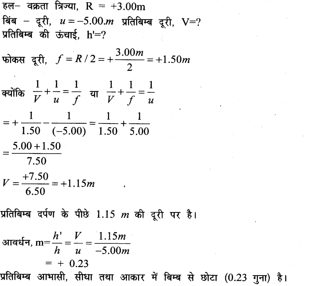 किसी ऑटोमोबाइल में पीछे का दृश्य देखने के लिए उपयोग होने वाले उत्तल दर्पण की वक्रता त्रिज्या 3.00 m है। यदि एक बस इस दर्पण से 5.00m की दूरी पर स्थित है तो प्रतिबिम्ब स्थिति, प्रकृति तथा आकार ज्ञात कीजिए।